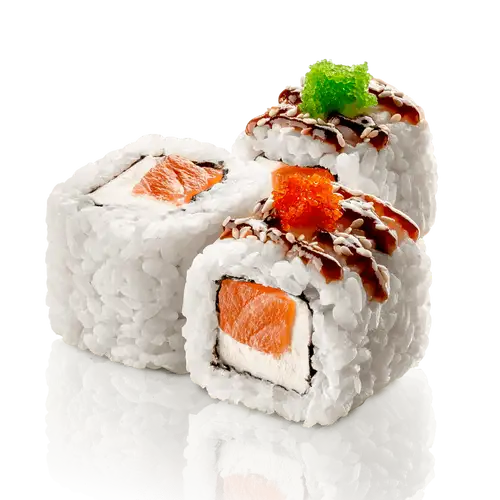 Лосось, сливочный сыр, два вида икры тобико, кунжут, соус унаги, нори, рис заправленный