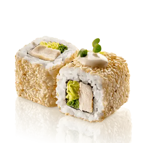 Копченая курица, салат айсберг, кунжут, зеленый лук, соус токио, микрозелень, нори, рис заправленный