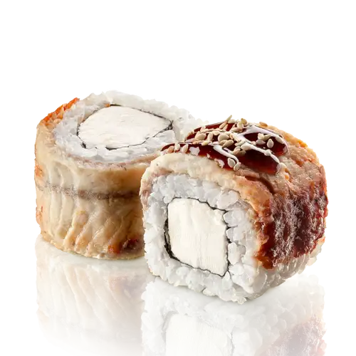 Угорь, сливочный сыр, соус унаги, кунжут, нори, рис заправленный