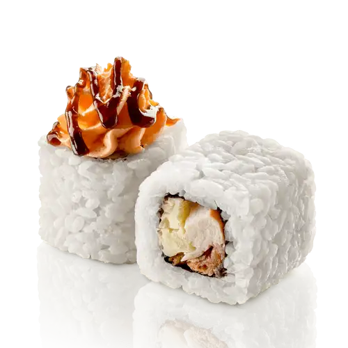 Копченая курица, тамаго, лук фри, сливочный сыр, икра тобико, соус унаги, нори, рис заправленный
