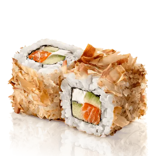 Копченый лосось, огурец, сливочный сыр, авокадо, стружка тунца, нори, рис заправленный