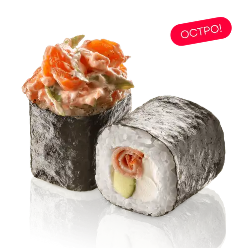 Копченый лосось, бекон, сливочный сыр, огурец, зеленый лук, соус спайс, нори, рис заправленный