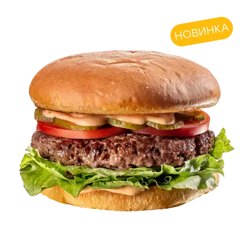 Булочка бриошь, котлета из мраморной говядины, салат айсберг, томат, маринованные огурцы, соус бургер