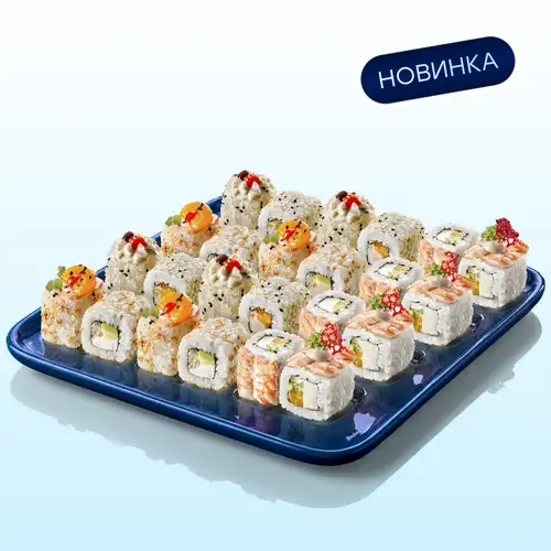 Ролл с креветкой, мандарином и соусом юдзу / Ролл с угрем и мандарином / Венеция с хурмой и трюфелем