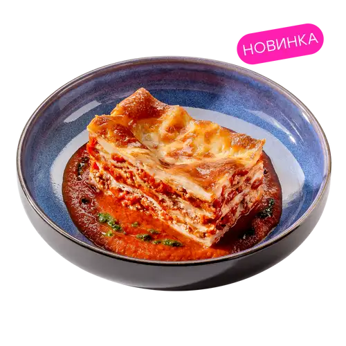 Паста лазанья, фарш из свинины, томатный соус, соус бешамель, морковь, лук, сельдерей, моцарелла, пармезан, соус песто