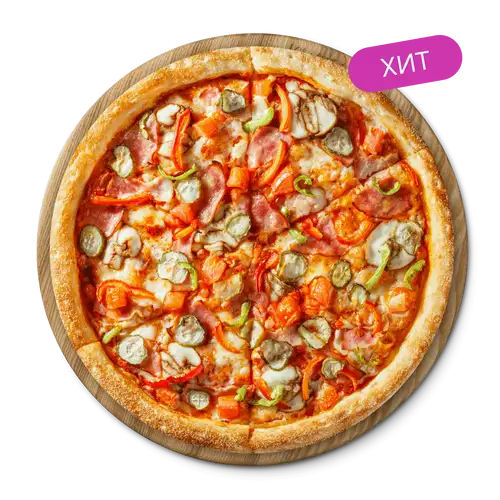 Томатный соус, куриное филе, бекон, ветчина, моцарелла, маринованные огурцы, томаты, болгарский перец