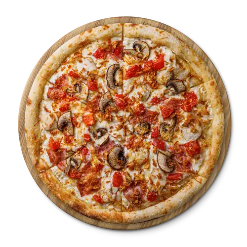 Сливочный соус, куриное филе, ветчина, моцарелла, копчёный сыр скаморца, томаты, королевские шампиньоны, лук фри