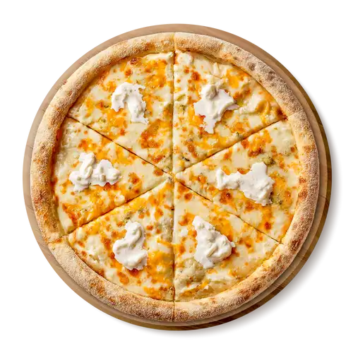 Соус альфредо, дор блю, моцарелла, чеддер, пармезан, страчателла, копчёный сыр скаморца, трюфельная соль, черный перец
