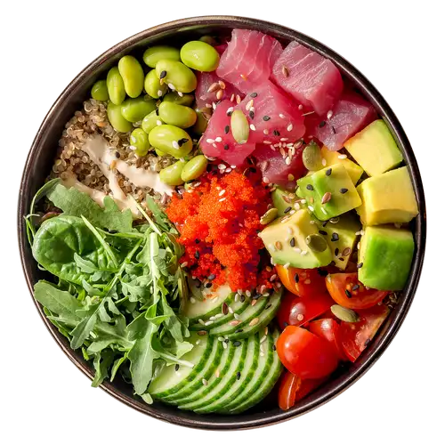 Тунец, киноа, салат микс, бобы эдамаме, огурец, томаты черри, авокадо, масаго, смесь семян, кунжут, соус трюфельный