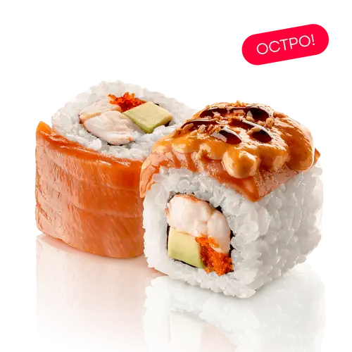 Опаленный лосось, креветка, икра тобико, авокадо, авторский кунжут кимчи, соус спайси, соус унаги, нори, рис заправленный