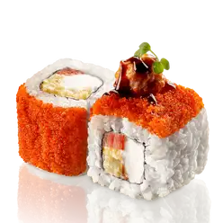 Больше размер - больше начинки! Тигровая креветка, сливочный сыр, икра тобико, томат, омлет тамаго, микрозелень, соус масаго (майонез, масаго оранжевая), соус унаги, нори, рис заправленный
