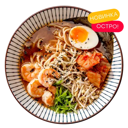 Бульон кимчи, пшеничная лапша, маринованное яйцо, капуста кимчи, зелёный лук, ростки сои, кунжут