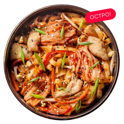Лапша удон, капуста кимчи, перец болгарский, лук красный, лук зеленый, морковь, кунжут, соевые ростки, соус устричный-ким чи