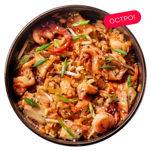 Рис, капуста кимчи, перец болгарский, лук красный, лук зеленый, морковь, кунжут, соевые ростки, соус устричный кимчи