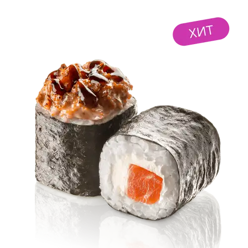 Лосось, грибы шиитаке, сливочный сыр, икра тобико, майонез, соус унаги, нори, рис заправленный
